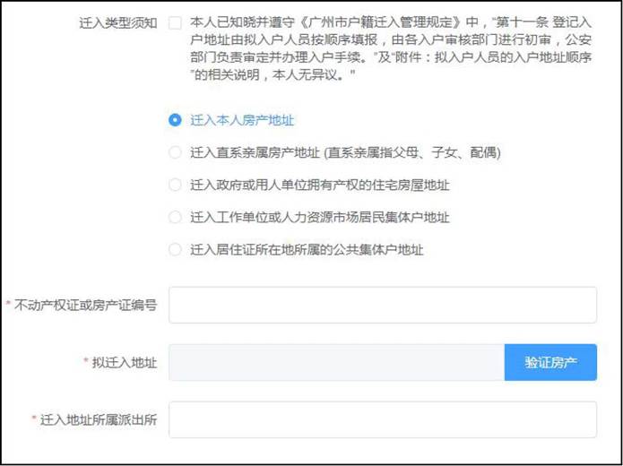 勾选“迁入类型须知”“迁入本人房产地址”(夫妻共有产权的请选择本人房产),填写“不动产权证房产证编号”点击【验证产权】,系统会自动填入拟迁入地址,选择“迁入地址所属派出所”。注意务必按以下顺序填写,如下图:
